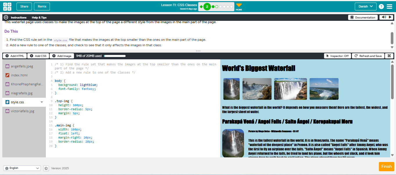 disini setelah kita perbesar maka gambar air terjun yang dipaling atas tidak beraturan, untuk merapihkannya kalian masuk ke style.css dan ikuti contoh seperti gambar yang diatas.